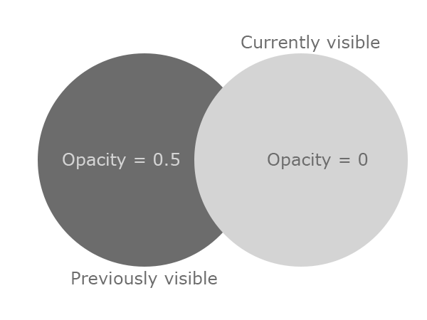 When the target entity's FOV updates each turn, the visibility tilemap checks a target's FOV. I used a C# HashSet of coordinates to represent each entity's FOV. The visibility system monitors a target's FOV and sets each visible tile's opacity to 0. Previously visible tiles' opacities are then set to 0.5. Determining which tiles were previously visible is as simple as taking the difference between the last turn's visible tiles and this turn's visible tiles (Previous - Current).
